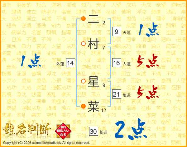 二村星菜さんの総運は30画の2点!