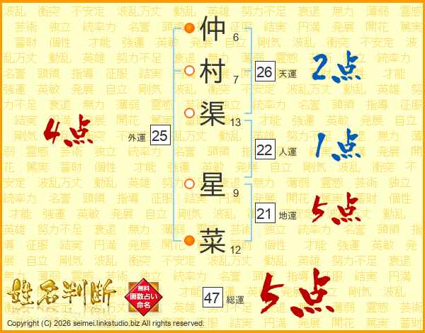 仲(6画)村(7画)渠(13画) 星(9画)菜(12画)
