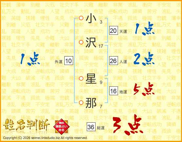 小(3画)沢(17画) 星(9画)那(7画)