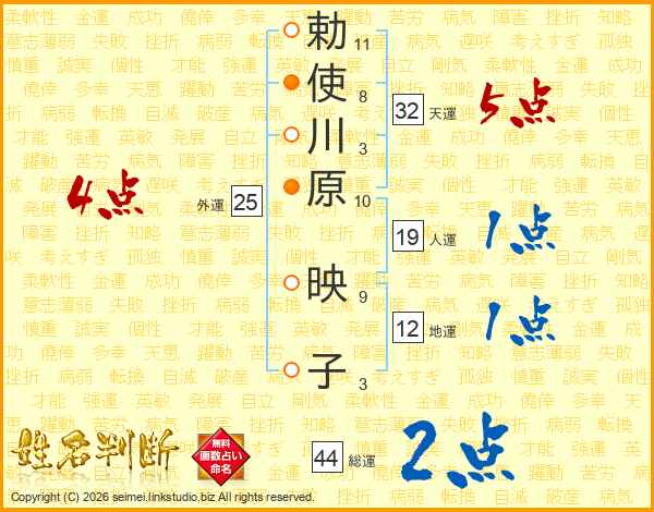 勅(11画)使(8画)川(3画)原(10画) 映(9画)子(3画)