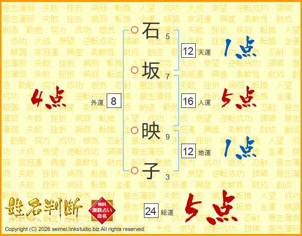 生活面を象徴する運勢です。外部から受ける影響力を表し、結婚運、家庭運や職場、環境への順応性を表します。総運から人運を引いた画数。姓や名が1文字の場合を除く。