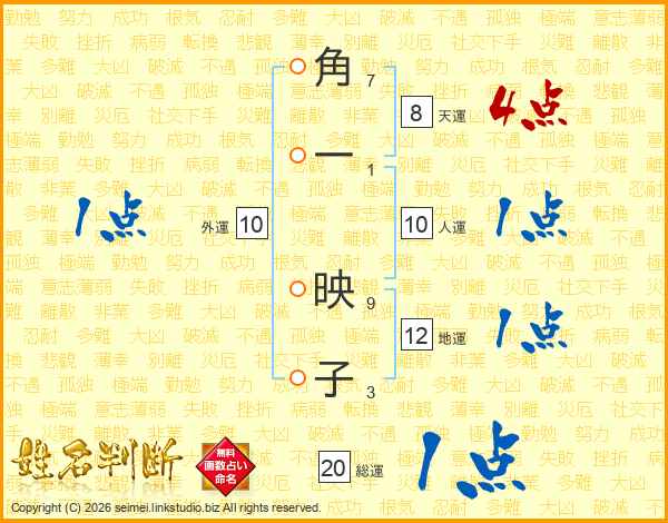 画数の奇数(○陽)と偶数(●陰)の配列で吉凶を占います。どちらかにかたよる名前は大凶名で避ける必要があります。画数の奇数偶数。