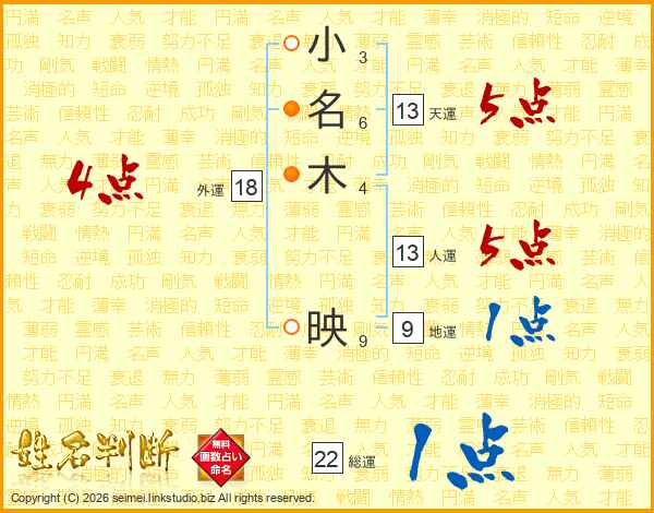 小(3画)名(6画)木(4画) 映(9画)