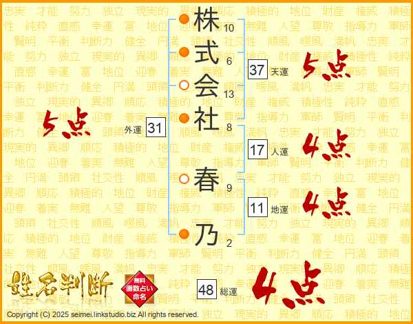 株(10画)式(6画)会(13画)社(8画) 春(9画)乃(2画)