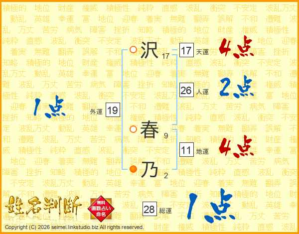 沢(17画) 春(9画)乃(2画)