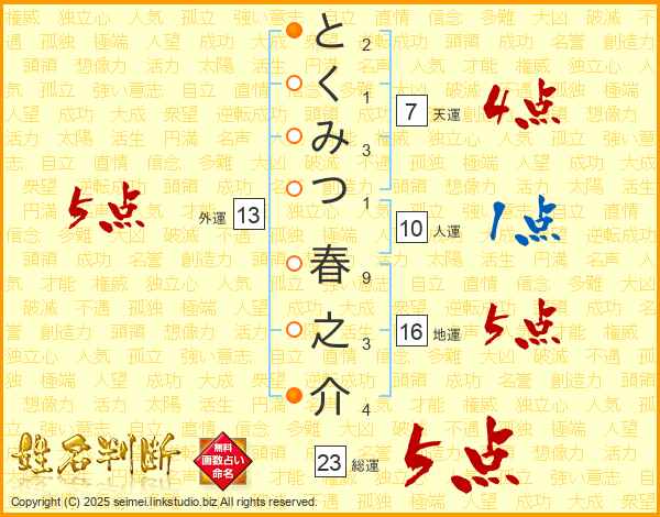 と(2画)く(1画)み(3画)つ(1画) 春(9画)之(3画)介(4画)