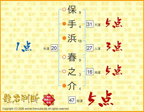 保(9画)手(4画)浜(18画) 春(9画)之(3画)介(4画)