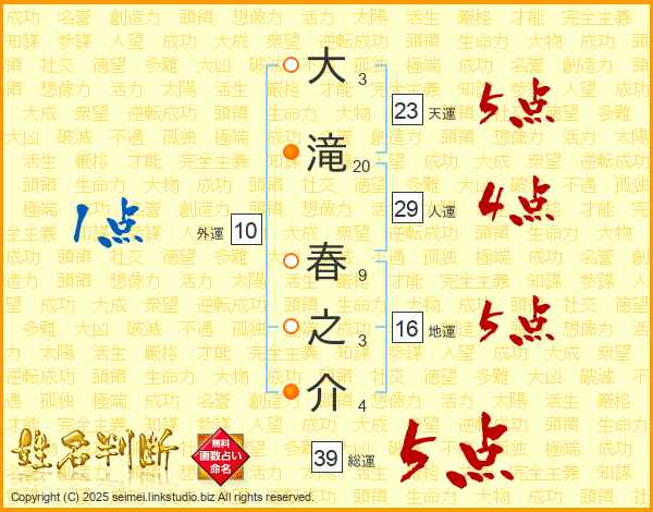 大(3画)滝(20画) 春(9画)之(3画)介(4画)