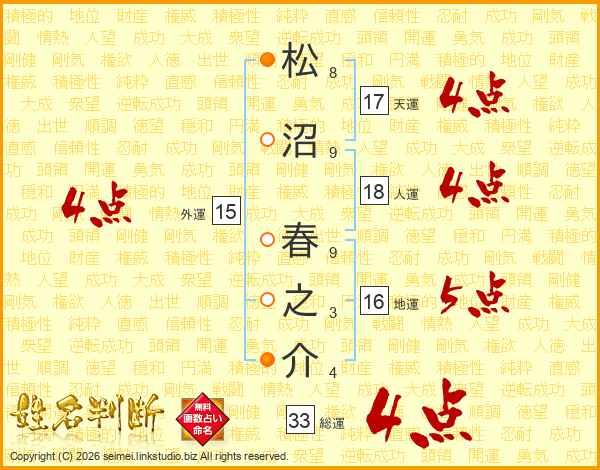 松(8画)沼(9画) 春(9画)之(3画)介(4画)
