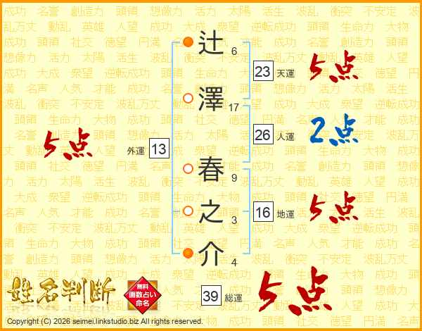 辻(6画)澤(17画) 春(9画)之(3画)介(4画)