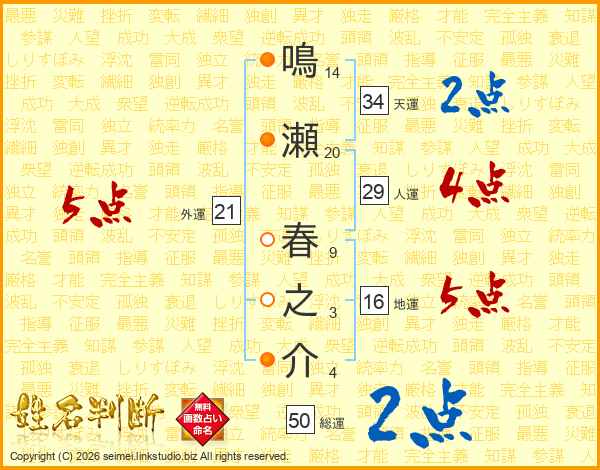 鳴瀬春之介さんの外運は21画の5点!