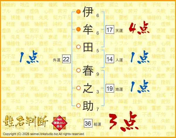 伊(6画)牟(6画)田(5画) 春(9画)之(3画)助(7画)