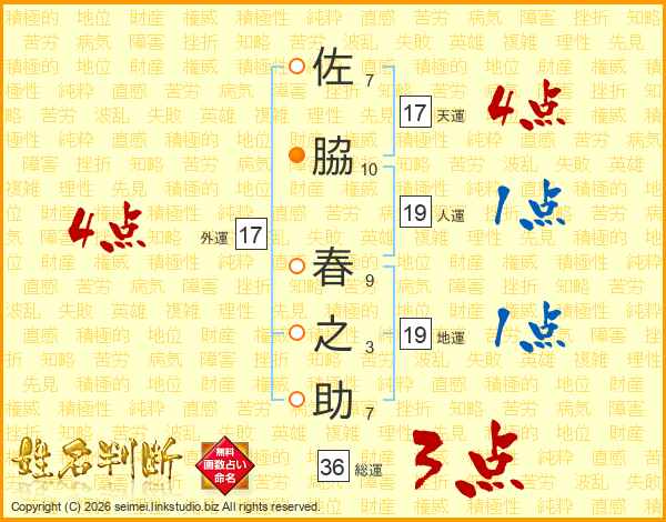 佐(7画)脇(10画) 春(9画)之(3画)助(7画)