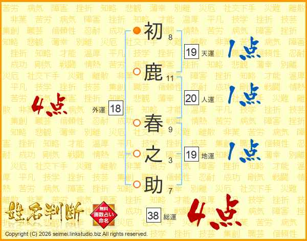 初(8画)鹿(11画) 春(9画)之(3画)助(7画)