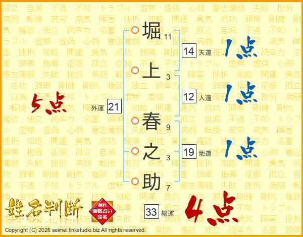 堀(11画)上(3画) 春(9画)之(3画)助(7画)