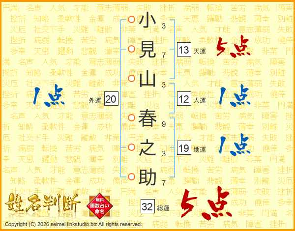 小(3画)見(7画)山(3画) 春(9画)之(3画)助(7画)