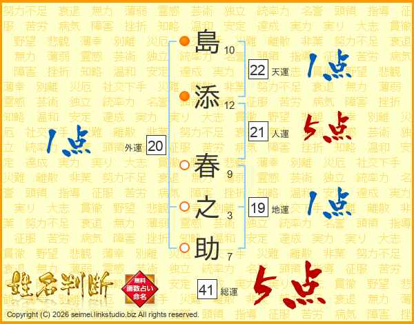 島(10画)添(12画) 春(9画)之(3画)助(7画)