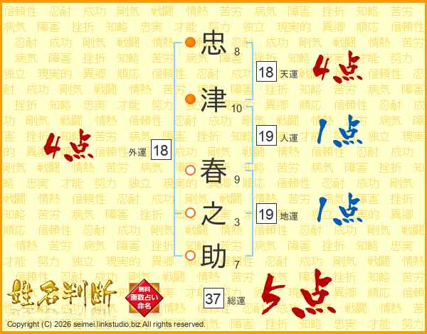 忠津春之助さんの総運は37画の5点!