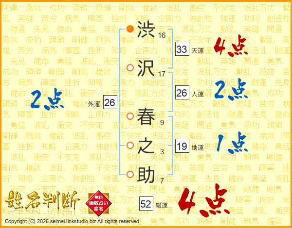 渋沢春之助さんの総運は52画の4点!
