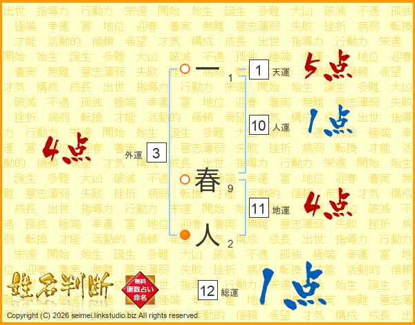 あなたの人生を表す1番重要な運勢です。生涯を通じて影響する総合運となり、主に50歳以降の晩年期に影響を及ぼします。苗字と名前の合計画数。