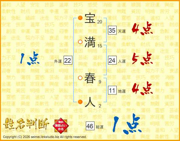 宝(20画)満(15画) 春(9画)人(2画)
