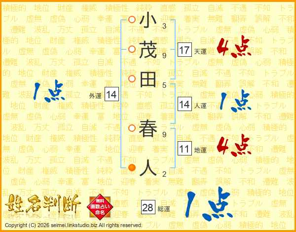 小(3画)茂(9画)田(5画) 春(9画)人(2画)