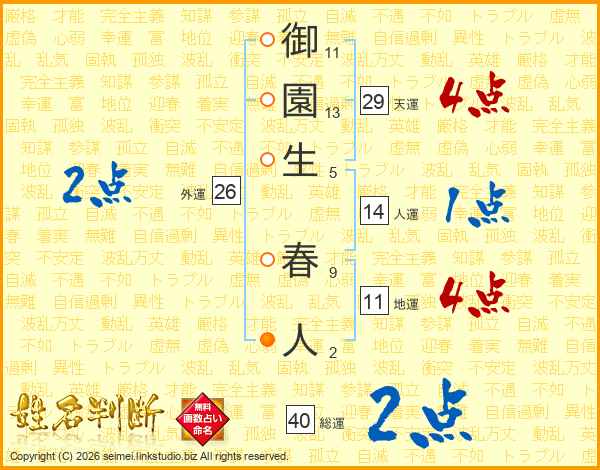 御(11画)園(13画)生(5画) 春(9画)人(2画)