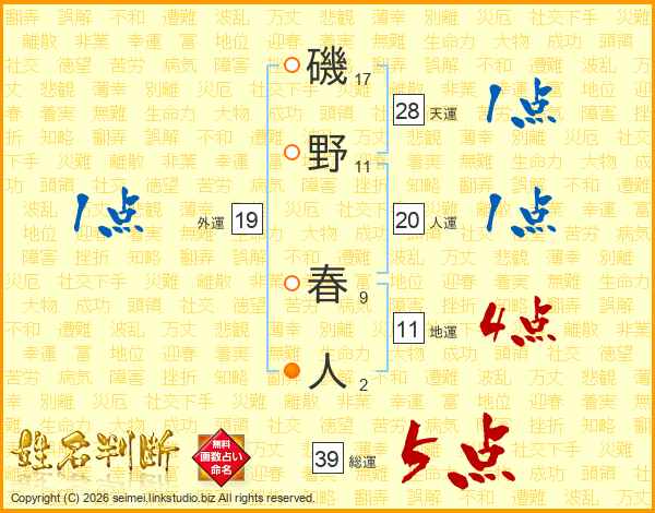 磯野春人さんの総運は39画の5点!