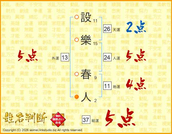 設樂春人さんの総運は37画の5点!