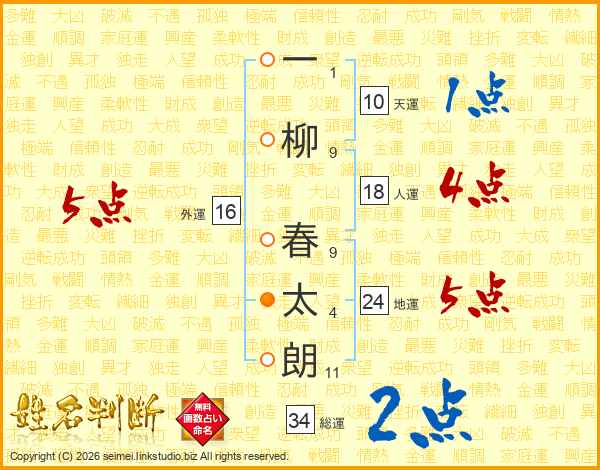 一(1画)柳(9画) 春(9画)太(4画)朗(11画)