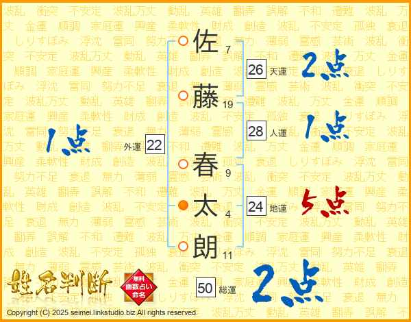 佐(7画)藤(19画) 春(9画)太(4画)朗(11画)