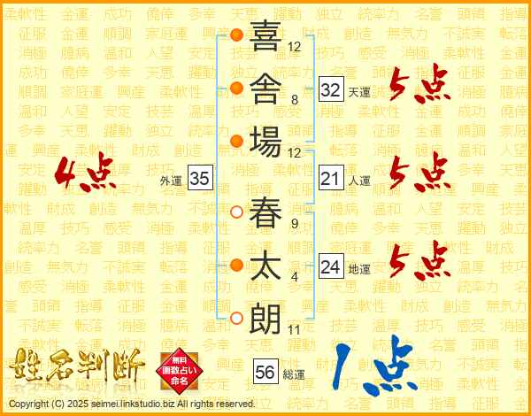 喜(12画)舎(8画)場(12画) 春(9画)太(4画)朗(11画)