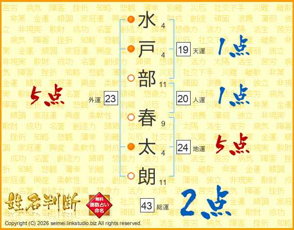 水(4画)戸(4画)部(11画) 春(9画)太(4画)朗(11画)