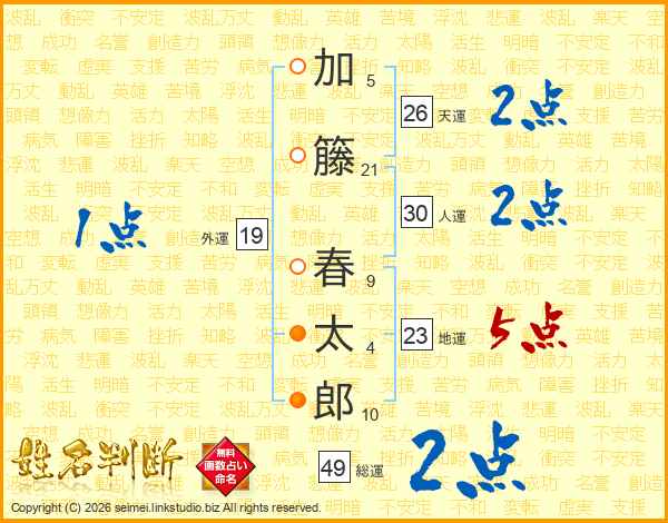 加(5画)籐(21画) 春(9画)太(4画)郎(10画)
