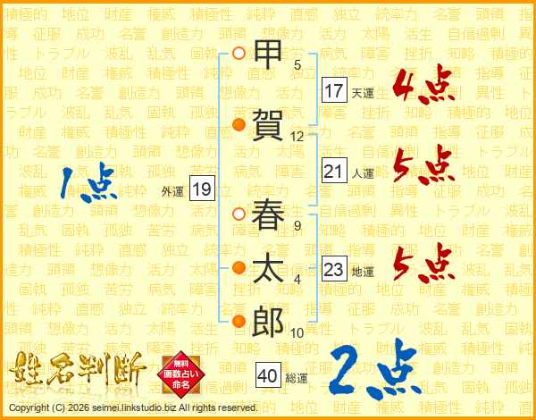 甲(5画)賀(12画) 春(9画)太(4画)郎(10画)