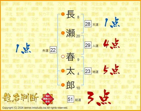 長(8画)瀬(20画) 春(9画)太(4画)郎(10画)