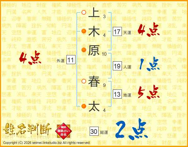上(3画)木(4画)原(10画) 春(9画)太(4画)
