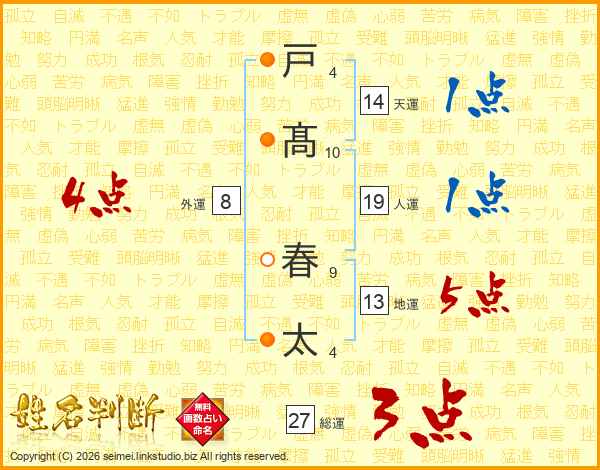 生活面を象徴する運勢です。外部から受ける影響力を表し、結婚運、家庭運や職場、環境への順応性を表します。総運から人運を引いた画数。姓や名が1文字の場合を除く。