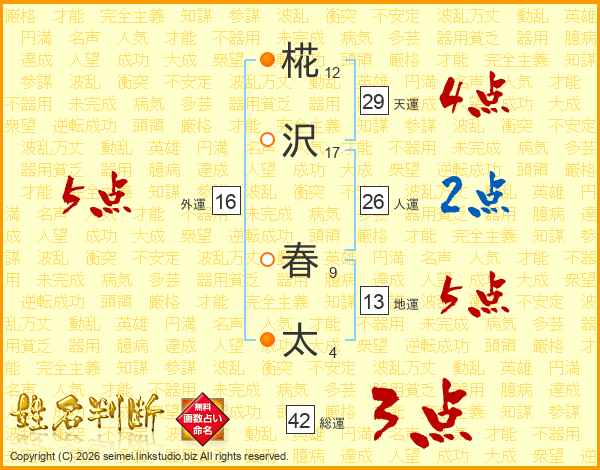 椛(12画)沢(17画) 春(9画)太(4画)