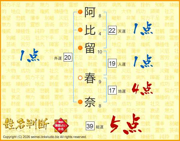 阿比留春奈さんの総運は39画の5点!