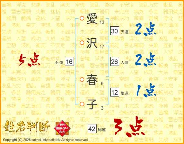 愛沢春子さんの総運は42画の3点!