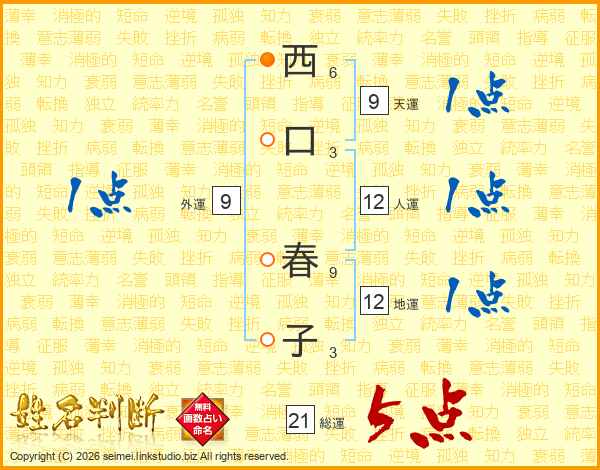 西口春子さんの総運は21画の5点!