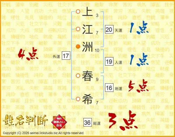 生活面を象徴する運勢です。外部から受ける影響力を表し、結婚運、家庭運や職場、環境への順応性を表します。総運から人運を引いた画数。姓や名が1文字の場合を除く。