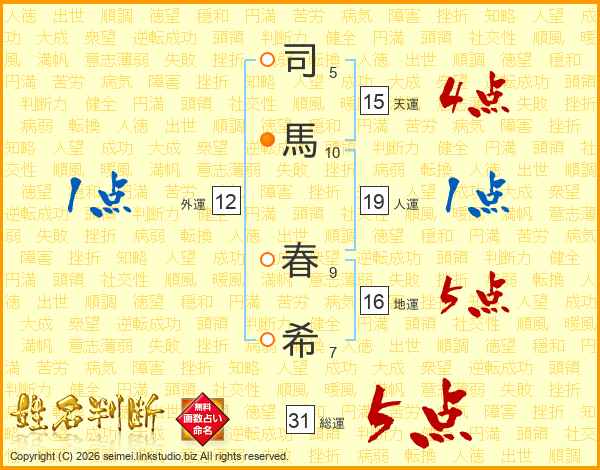 あなたの人生を表す1番重要な運勢です。生涯を通じて影響する総合運となり、主に50歳以降の晩年期に影響を及ぼします。苗字と名前の合計画数。