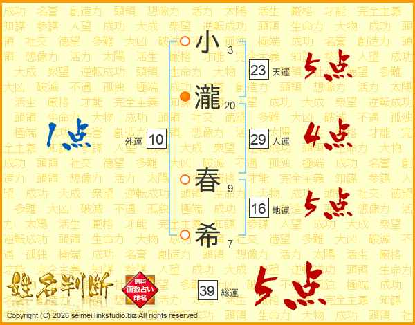 小(3画)瀧(20画) 春(9画)希(7画)