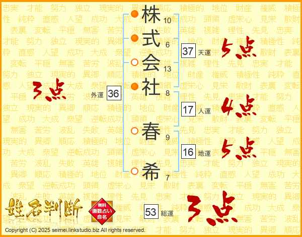 株(10画)式(6画)会(13画)社(8画) 春(9画)希(7画)