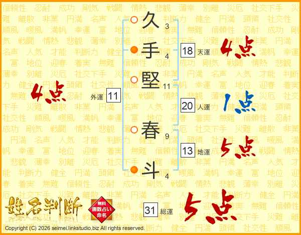 久(3画)手(4画)堅(11画) 春(9画)斗(4画)