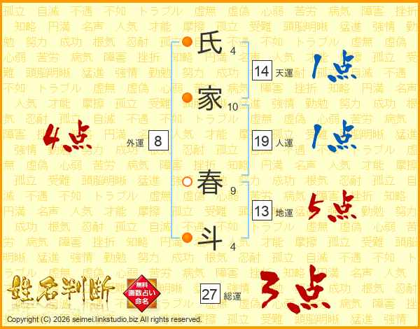 氏(4画)家(10画) 春(9画)斗(4画)