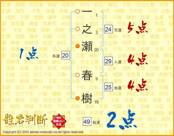 一之瀬春樹さんの総運は49画の2点!