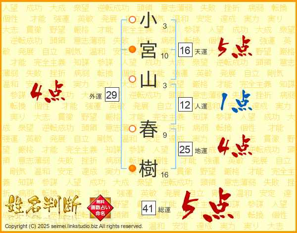 小(3画)宮(10画)山(3画) 春(9画)樹(16画)